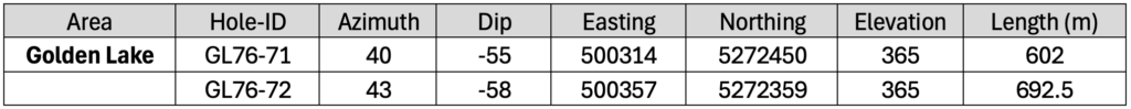 *Table 2 – Golden Lake Zone intercepts