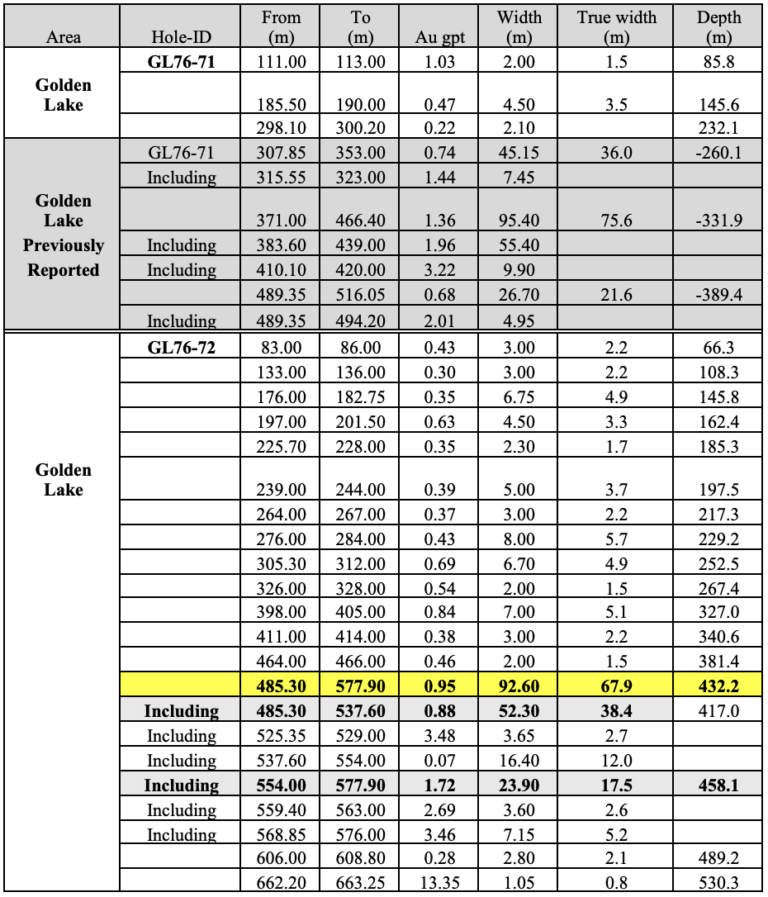- Similar to the previously announced drill hole GL 76-71 (95.4m of 1.36 g/t gold March 2, 2026) this new gold intercept at GL 76-72 further expands the gold mineralization at the Golden Lake deposit bringing in mineralization which was outside the last mineral resource estimate (effective date September 29, 2025, see note below), see Figure 2.