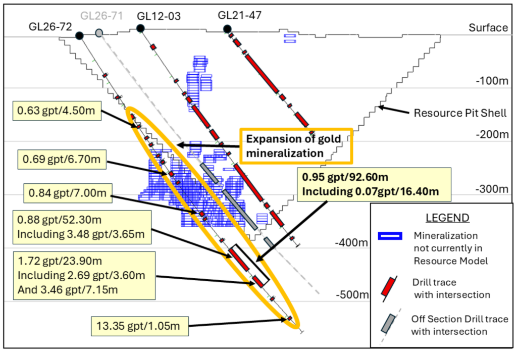 - As a result of the significant intercept at GL 76-71 (95.4m of 1.36 g/t announced March 2, 2026), a new hole, GL 76-76, is now being drilled at a 100m step back to GL 76-71. This is to test the extension of the mineralization in a southwest trend in an effort to test the width of the mineralized zone.