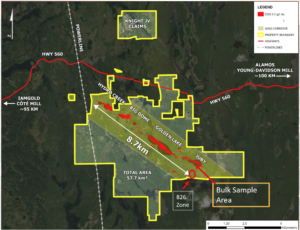 Figure 1 – Property Layout showing main deposits and bulk sample area